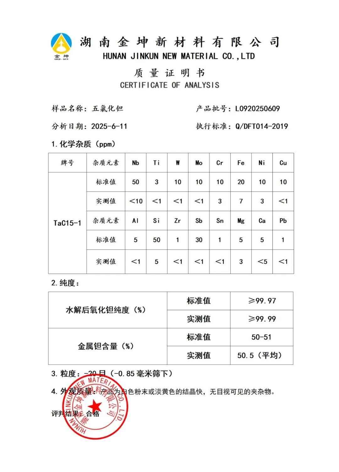 1、五氯化钽3N5—NXJBKL0920250609