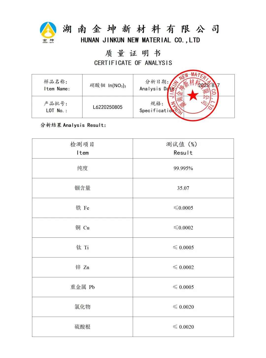 硝酸铟4N5—L6220250805