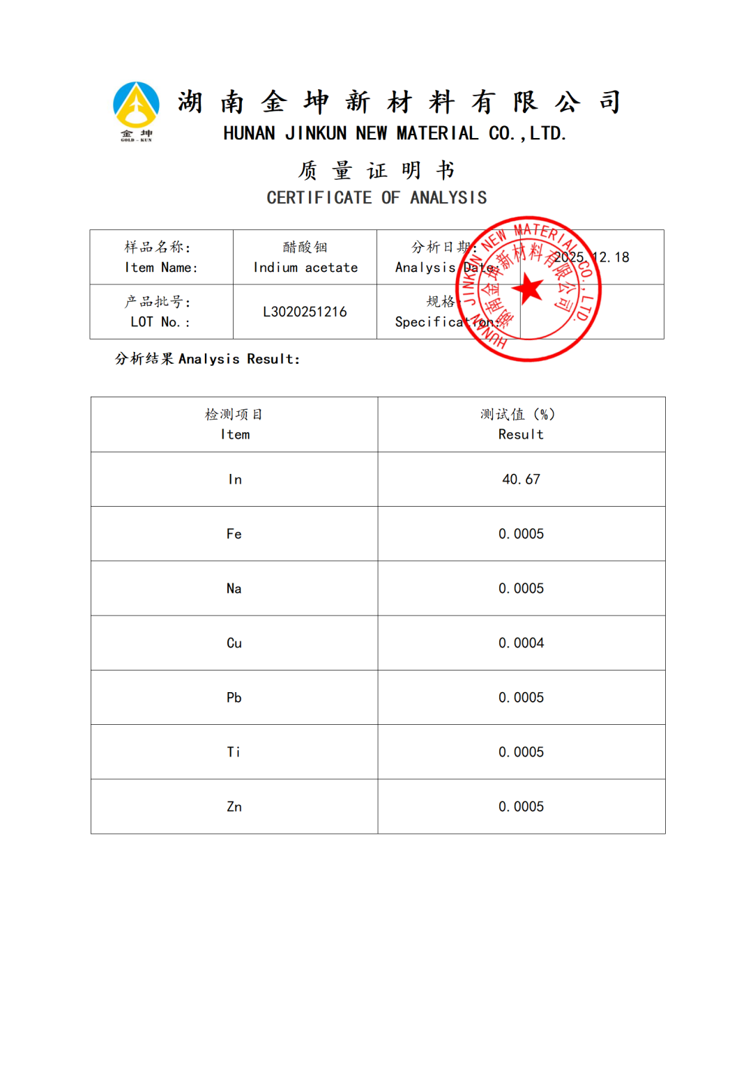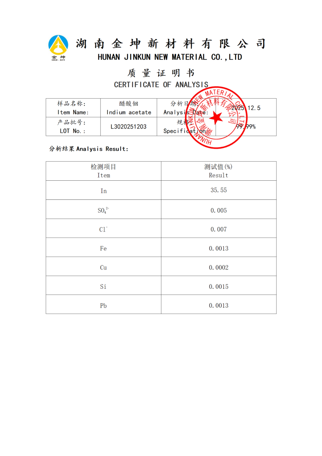 1、醋酸铟 4N-QXHGL3020251203